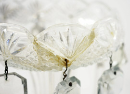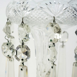 Coppia di candelieri in cristallo intagliato con pendenti, XX secolo, altezza cm 33 (mancanze e difetti)