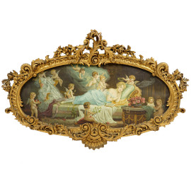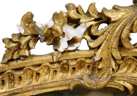 Coppia di cornici in legno e stucco dorato e intagliato, XX secolo, ingombro cm 93x144, battente cm 55.5x122 (difetti e rotture)