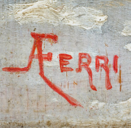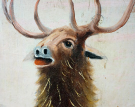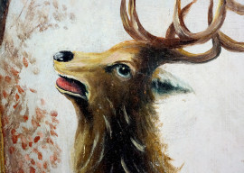 Coppia di dipinti raffiguranti due cervi entro un paesaggio innevato, olio su tavola, firmati A. Ferri, cm 74x23,5, entro cornice