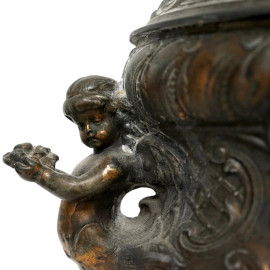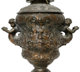 Coppia di lampade in metallo e vetro, decori a mascheroni e putti, altezza max cm 58 (difetti e rotture)