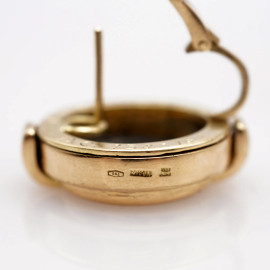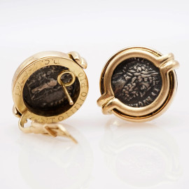 Coppia di orecchini Bulgari, in oro 750 con monete incastonate, cm 2.6x2.2, peso gr. 30.5