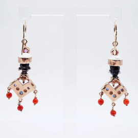 Coppia di orecchini moretti in oro 9 kt e argento 925 con pietre preziose incastonate, busto impreziosito da zaffiri e sfere di corallo pendenti, particolari smaltati, cm 3, peso gr. 39,4