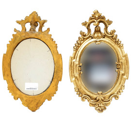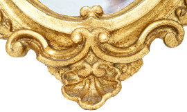 Coppia di piccole specchiere in legno scolpito e dorato, XIX secolo, cm h 45x26,5