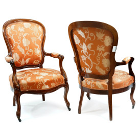 Coppia di poltrone in legno intagliato, schienale e seduta imbottite, cm h 100x59x48,5