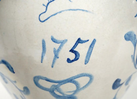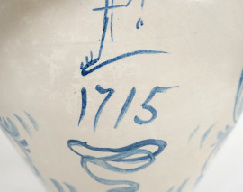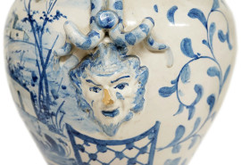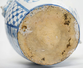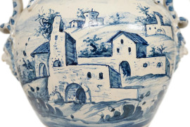 Coppia di vasi Savona in maiolica a smalto bianco e blu, decorati sul fronte a raffigurare un paesaggio, sul retro recanti marchio Lanterna e data, anse a foggia di serpentelli, cm h 50 circa, (difetti e mancanze)