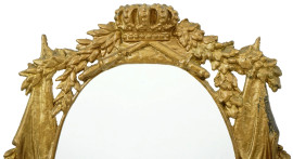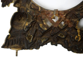 Cornice ovale in metallo dorato, decorata a rilievo con trofei militari e corona alla sommità, cm h 52x34,5x15,5, (difetti)