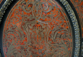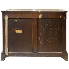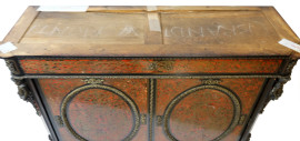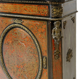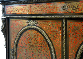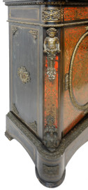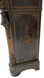 Credenza stile Boulle, XX secolo, in legno ebanizzato con intarsi e applicazioni in metallo dorato, fronte a due ante, piedi a mensola, cm h 108,5x131,5x41,5, (difetti)
