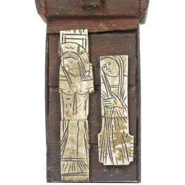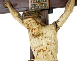 Crocifisso in legno policromo, con applicata icona da viaggio, XX secolo, cm 60x30, (difetti)