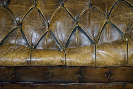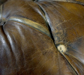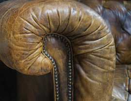 dalla caratteristica sagoma con braccioli arrotondati in linea con lo schienale, interamente rivestito in pelle marrone trapuntata capitonnè.