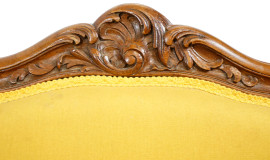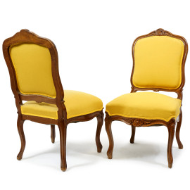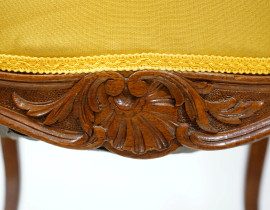 Due poltroncine in noce, inizi XX secolo, con seduta e schienale imbottiti e rivestiti in tappezzeria gialla, cm h 88.5, (difetti)