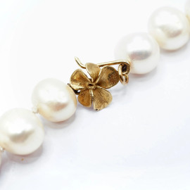 Girocollo di perle scaramazze con chiusura in oro 18 Kt a forma di fiore, cm 45,5, peso gr. 80