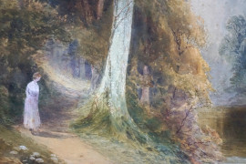 Paesaggio fluviale con figura, acquarello su cartoncino, cm 75,5x51, entro cornice