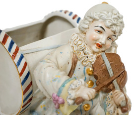 Gruppo in porcellana policroma raffigurante musicisti, XX secolo, marca sotto la base, cm h 27