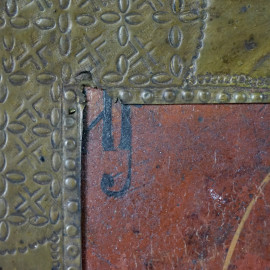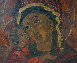 Icona russa raffigurante la Madonna con il Bambino, olio su tavola, XIX secolo, cm 32x27