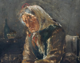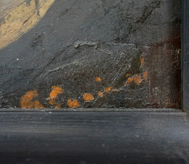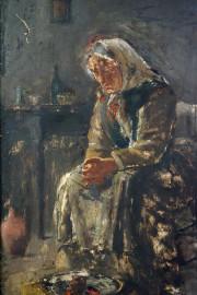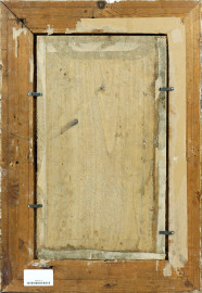 Interno con anziana che si scalda al focolare, olio su tavola, firmato in basso a destra, cm 43,3x25, entro cornice