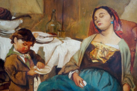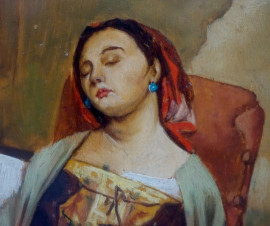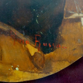 Interno con scena familiare, olio su tavoletta in assetto ovale, firmata [...] Russo, cm 26x19, entro cornice