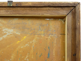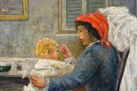 La pappa, olio su cartone telato, cm 38x31, firmato, entro cornice, (restauri)