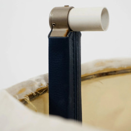 Lampada da tavolo in metallo cromato a quattro luci, bracci rivestiti in pelle blu, XX secolo, altezza cm 73, diametro cm 43 (difetti)