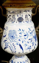 Lampada in porcellana blu e bianca e metallo con decori a motivi vegetali e floreali, XX secolo, altezza cm 47 circa