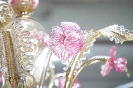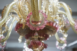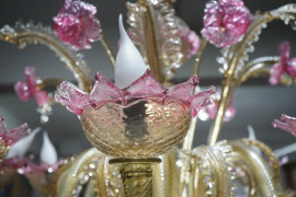 Lampadario a otto luci in vetro soffiato di Murano, XX secolo, color ambra con fiori a profili rosa, cm h 90 circa