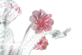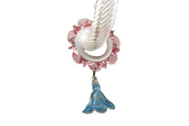 Lampadario in vetro di Murano, XX secolo, a sei braccia portacandela con profili e fiori celesti e rosa, cm h 87, (difetti)