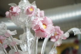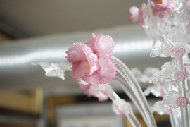 Lampadario in vetro di Murano, XX secolo, a sei braccia portacandela mosse con bobeches a tulipano tra trionfo di foglie e fiori in paste vitree rosa, cm h 76, (difetti)