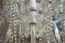 Lampadario in vetro trasparente a 11 luci, con pendenti e gocce in cristallo, XX secolo, cm h 126.5 circa, (difetti)