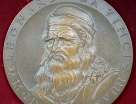 Leonardo da Vinci, medaglia in bronzo, XX secolo, diametro cm 19,5, entro cornice