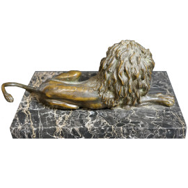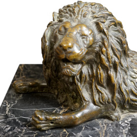Leone, scultura in bronzo brunito, poggiante su base in marmo, cm h 10x30x11 circa