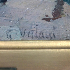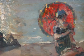 L'ombrello rosso, olio su cartone, cm 15.5x14, firmato G. Villani, entro cornice