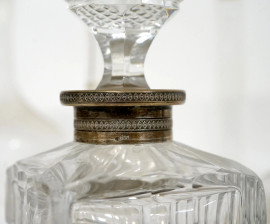 Lotto composto da 13 bottiglie in cristallo controtagliato e vetro molato, con finiture in argento, XX secolo, h max cm 36, (difetti)