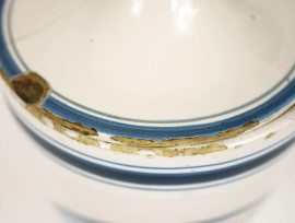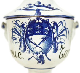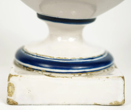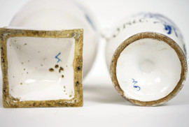 Lotto composto da due vasi da farmacia in maiolica e ceramica a smalto bianco e blu, manifatture diverse, h max cm 30, (difetti)