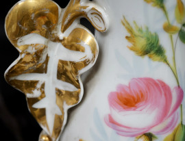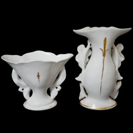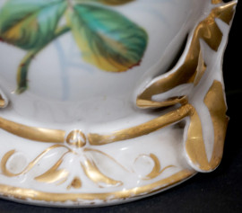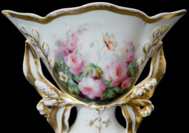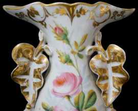 Lotto composto da due vasi in porcellana policroma con finiture dorate, corpo decorato con rose, XX secolo, altezza max cm 27,5