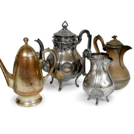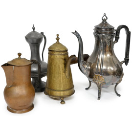 Lotto composto da otto caffettiere in metallo e rame, misura max cm 28 (difetti e mancanze)