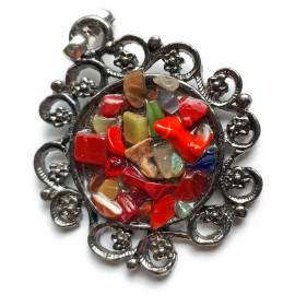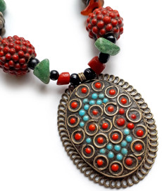 Lotto composto da una collana vintage in pietre dure con pendente, un pendente in metallo brunito a fuoco con inclusione di frastagliatura di pietre dure policrome e un bracciale in perle di pietra lavica opaca con inclusione in ossidiana lucida