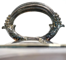Lotto composto da una coppia di candelieri e un portavivande con coperchio in metallo argentato, misura max cm 21,8x28