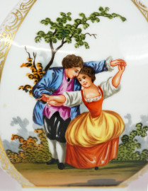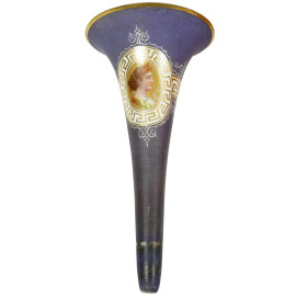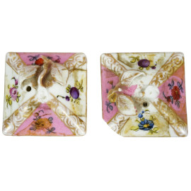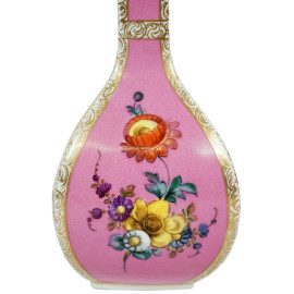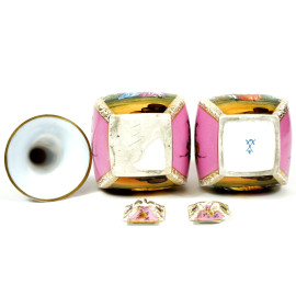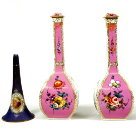 Lotto composto da una coppia di vasi e un vasetto monofiore in porcellana policroma, altezza max cm 32 (difetti)
