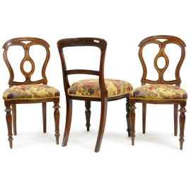 Lotto composto da una sedia in legno con schienale a giorno, gambe anteriori tornite e posteriori a sciabola, e di due sedie in legno con schienale a giorno e cartella traforata, gambe anteriori tornite, fine del XIX secolo, misura max cm 86.5x44x35 (difetti)