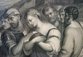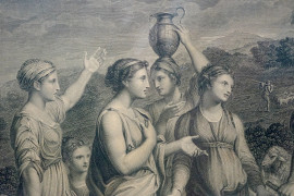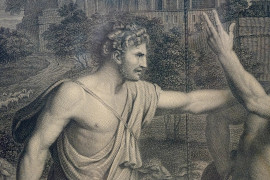 Lotto di due incisioni di Pietro Andreloni (Brescia 1785– Galbiate, 1849), da Nicolas Poussin e Tiziano Vecellio, cm 58x78,5, XIX secolo, entro cornici, (difetti)
