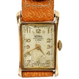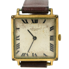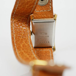 Lotto di due orologi da polso da donna, marche Technos e Jean Perret, casse in metallo dorato e cinturini in pelle, lunghezza max cm 20,8, (meccanismi da revisionare, difetti)