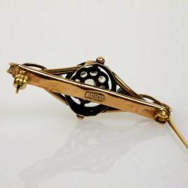 Lotto di due spille in oro 9 kt e metallo dorato, con zirconi e microperla, lunghezza max cm 4, peso della spilla in oro gr. 4 (imperfezioni)