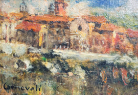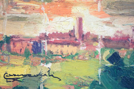 Lotto di tre piccoli dipinti raffiguranti due paesaggi e un gruppo di pecore in un prato, olio su cartone telato, cm 14,5x19, firmati Carnevali, entro cornici