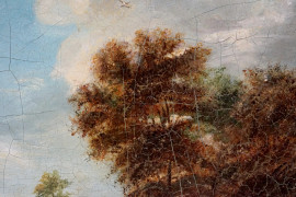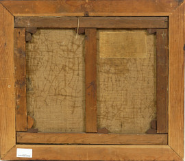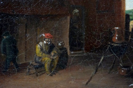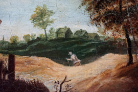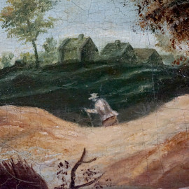 Maniera di David Teniers Il Giovane (Anversa, 1610 – Bruxelles, 1690), Paesaggio con case e contadino, olio su tela, cm 47x55, entro cornice