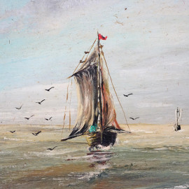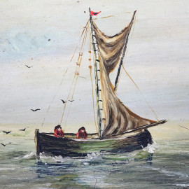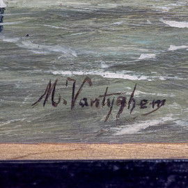 Martha Vantyghem (1923-2008), Marina con imbarcazioni, olio su tavoletta, firmato in basso a destra, cm 21x46, entro cornice