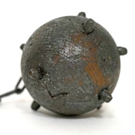 Mazzafrusta a tre teste, replica ornamentale di mazza medievale con 3 sfere chiodate in legno, lunghezza cm 39