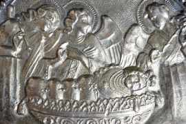 Medaglia in bronzo dorato raffigurante Gesù bambino vegliato da tre angeli, diametro cm 10,4