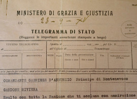 Ministero di grazia e giustizia, telegramma di Stato del Ministro guardasigilli Solmi al comandante Gabriele D'Annunzio, 23-9-XV (1936-37)