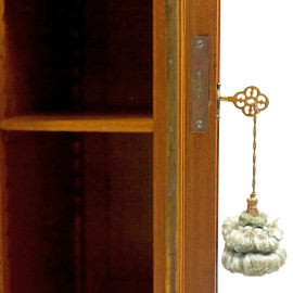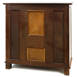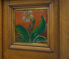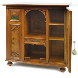 Mobiletto Art Nouveau in legno a due sportelli, un cassettino e due ripiani, cm h 91x40x89,5