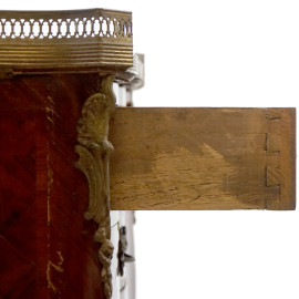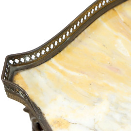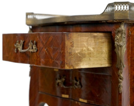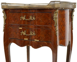 Mobiletto in legno intarsiato, prima metà del XX secolo, con piano in marmo, fronte a due cassetti e quattro gambe mosse, cm h 72x35,5x44, (difetti e mancanze)