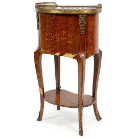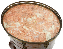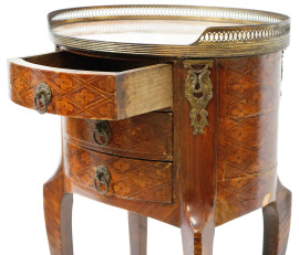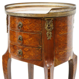 Mobiletto in legno intarsiato, prima metà del XX secolo, con piano in marmo e fronte a tre cassetti, gambe mosse, cm h 70x39x30, (difetti)